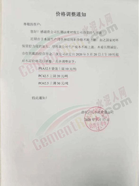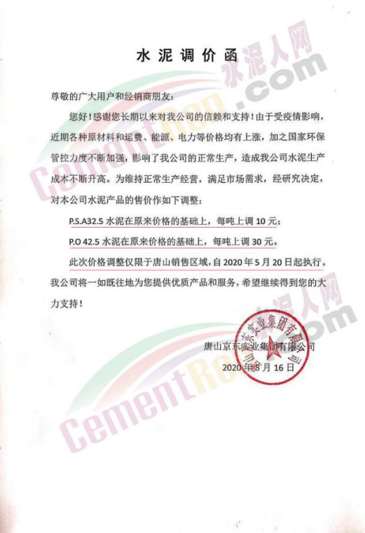 5月16日,唐山京東實業(yè)集團有限公司通知,根據(jù)市場變化情況,自2020年5月20日起,P.S.A32.5水泥在原來價格的基礎(chǔ)上,每噸上調(diào)10元,P.O42.5水泥在原來價格的基礎(chǔ)上,每噸上調(diào)30元。