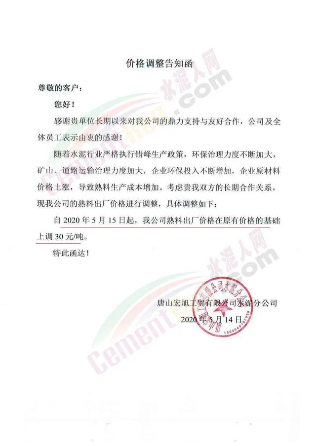 5月14日,唐山宏旭工貿(mào)有限公司水泥分公司發(fā)布通知稱:隨著水泥行業(yè)嚴(yán)格執(zhí)行錯峰生產(chǎn)政策,環(huán)保治理力度不斷加大,礦山、道路運輸治理力度加大,企業(yè)環(huán)保投入不斷增加,企業(yè)原材料價格上漲,導(dǎo)致熟料生產(chǎn)成本增加。自2020年5月15日起,水泥出廠價格在原有價格的基礎(chǔ)上調(diào)30元/噸。