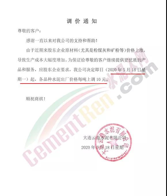 根據(jù)市場變化,我公司決定于2020年5月16日12:00對各水泥品種價格進行以下相關(guān)調(diào)整:M32.5袋裝、散裝上調(diào)40元/噸,P.C42.5袋裝、散裝上調(diào)40元/噸,P.O42.5袋裝、散裝上調(diào)20元/噸。