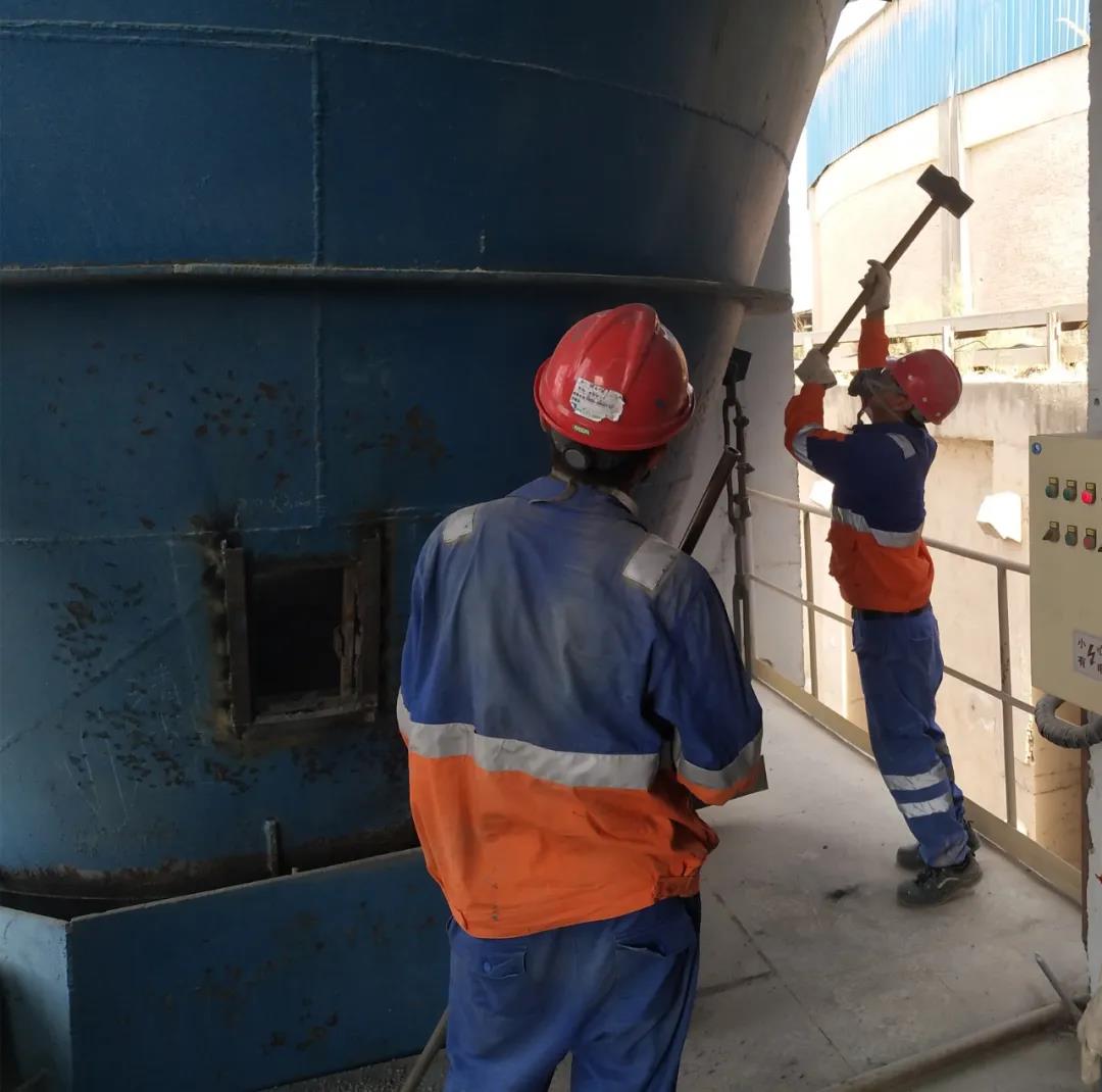 清庫(kù)前,大家制定好安全監(jiān)管制度、應(yīng)急預(yù)案,在作業(yè)現(xiàn)場(chǎng)認(rèn)真做了風(fēng)險(xiǎn)評(píng)估,辦理作業(yè)許可,嚴(yán)格按照LOTOTO程序9步驟進(jìn)行了操作,對(duì)庫(kù)外邊堆料區(qū)域進(jìn)行警示隔離。由于清庫(kù)作業(yè)屬于高風(fēng)險(xiǎn)作業(yè),為了降低風(fēng)險(xiǎn),大家輪番作業(yè),先使用大錘從庫(kù)錐鋼板倉(cāng)外部進(jìn)行敲擊,使用長(zhǎng)鋼釬、架管從庫(kù)頂測(cè)量孔、下料口對(duì)庫(kù)壁物料進(jìn)行清理,清除松動(dòng)物料。然后系上安全帶站在梯子上,用風(fēng)鎬對(duì)掛壁頑固的物料進(jìn)行清理,庫(kù)內(nèi)物料清下來(lái)后順著庫(kù)下邊的外接溜子輸送到外邊空地上。在清庫(kù)現(xiàn)場(chǎng),大家充分發(fā)揚(yáng)吃苦耐勞、精誠(chéng)團(tuán)結(jié)的工作作風(fēng),經(jīng)過(guò)4天的共同努力,順利地完成了兩個(gè)庫(kù)的清料任務(wù)。生料系統(tǒng)清庫(kù)工作的順利完成,不僅讓大家積累了清庫(kù)作業(yè)經(jīng)驗(yàn),同時(shí)為后期生產(chǎn)的穩(wěn)定運(yùn)行奠定了堅(jiān)實(shí)基礎(chǔ)。