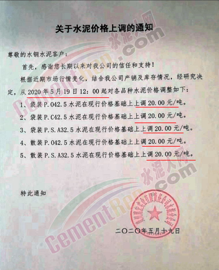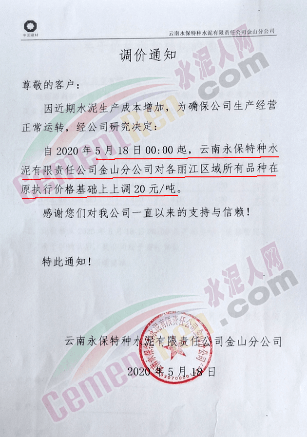 云南永保特種水泥有限責(zé)任公司金山分公司通知因近期水泥生產(chǎn)成本增加,為確保公司生產(chǎn)經(jīng)營正常運(yùn)轉(zhuǎn),經(jīng)公司研究決定 ,自5月18日0時(shí)起,云南永保特種水泥有限責(zé)任公司金山分公司對各麗江區(qū)域所有品種在原執(zhí)行價(jià)格基礎(chǔ)上上調(diào)20元/噸。