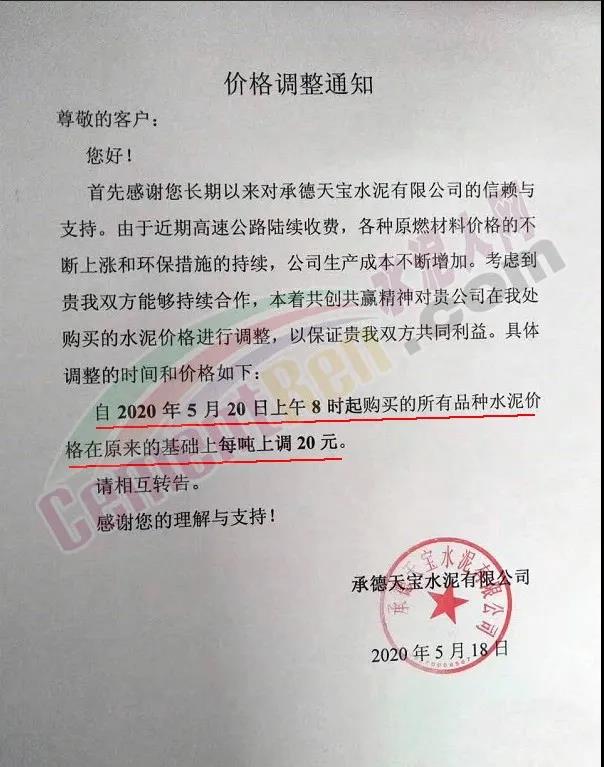 承德天寶水泥有限公司通知,由于近期高速公路陸續(xù)收費(fèi),各種原燃材料價(jià)格不斷上漲和環(huán)保措施的持續(xù),公司生產(chǎn)成本不斷增加。自5月20日上午8時(shí)起所有品種水泥價(jià)格在原來的基礎(chǔ)上上調(diào)20元/噸。