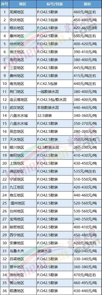 19日上饒地區(qū)水泥價(jià)格部分開始推漲20元/噸,市場主流P.O42.5散裝價(jià)格在430-450元/噸。