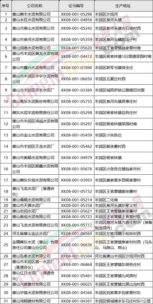 河北省唐山市豐潤區(qū)水泥企業(yè)名單