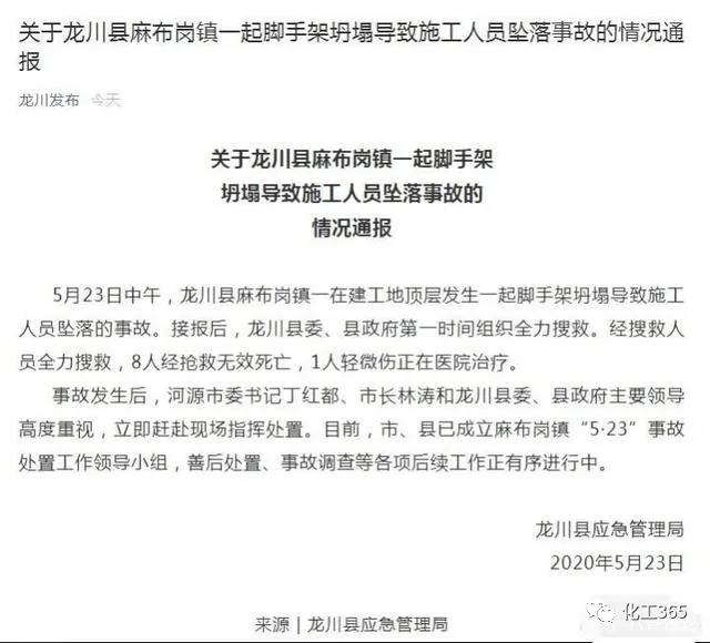 昨天中午,廣東省龍川縣麻布崗鎮(zhèn),一在建工地頂層發(fā)生一起腳手架坍塌導(dǎo)致施工人員墜落的事故。接報(bào)后,龍川縣委、縣政府第一時(shí)間組織全力搜救。經(jīng)搜救人員全力搜救,8人經(jīng)搶救無(wú)效死亡,1人輕微傷正在醫(yī)院治療。事故發(fā)生后,河源市委書記丁紅都、市長(zhǎng)林濤和龍川縣委、縣政府主要領(lǐng)導(dǎo)高度重視,立即趕赴現(xiàn)場(chǎng)指揮處置。當(dāng)?shù)匾殉闪⒙椴紞忔?zhèn)“5·23”事故處置工作領(lǐng)導(dǎo)小組,事故調(diào)查等后續(xù)工作正在進(jìn)行中。