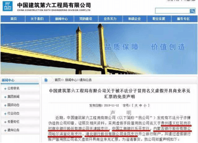 中國建筑第六工程局有限公司關(guān)于被不法分子冒用名義虛假開具商業(yè)承兌匯票的免責(zé)聲明近期,中國建筑第六工程局有限公司(以下簡稱“我公司”)發(fā)現(xiàn)有不法分子涉嫌偽造我公司印章、證照及相關(guān)資料,采用虛假手段冒用我公司名義于貴州遵義紅花崗農(nóng)村商業(yè)銀行股份有限公司天津路支行、中國工商銀行樂平支行、內(nèi)蒙古銀行股份有限公司哈爾濱宣化街支行、湖北銀行股份有限公司來鳳支行開立銀行賬戶,并通過虛假銀行賬戶冒用我公司名義虛假開具商業(yè)承兌匯票。