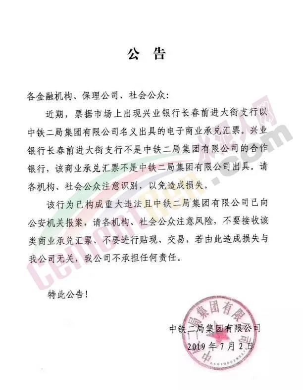 2019年7月,一批注明“中鐵二局集團(tuán)有限公司”,開戶行為“興業(yè)銀行長春前進(jìn)大街支行”的假冒承兌匯票也引起巨大關(guān)注。