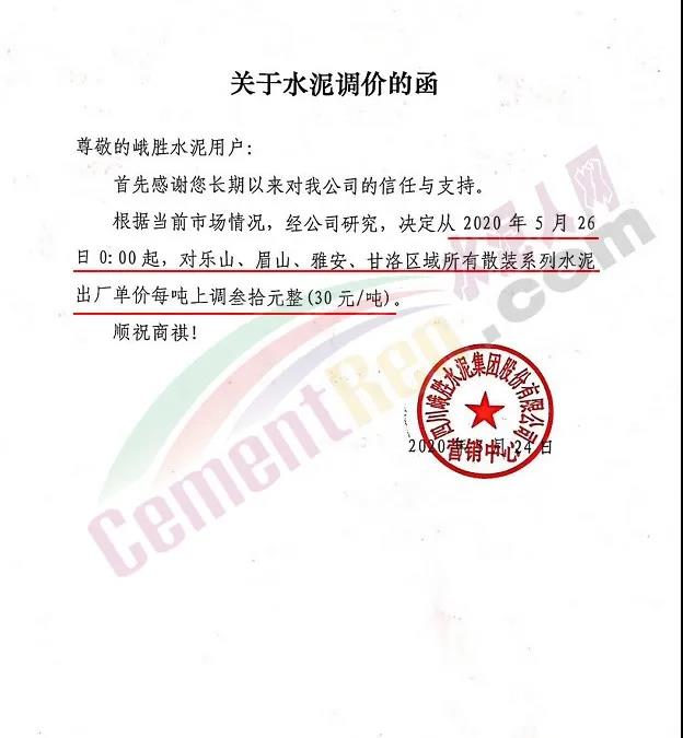 四川峨勝水泥通知自5月26日0時(shí)起,對(duì)樂山、眉山、雅安、甘洛區(qū)域所有散裝系列水泥出廠單價(jià)每噸上調(diào)30元/噸。