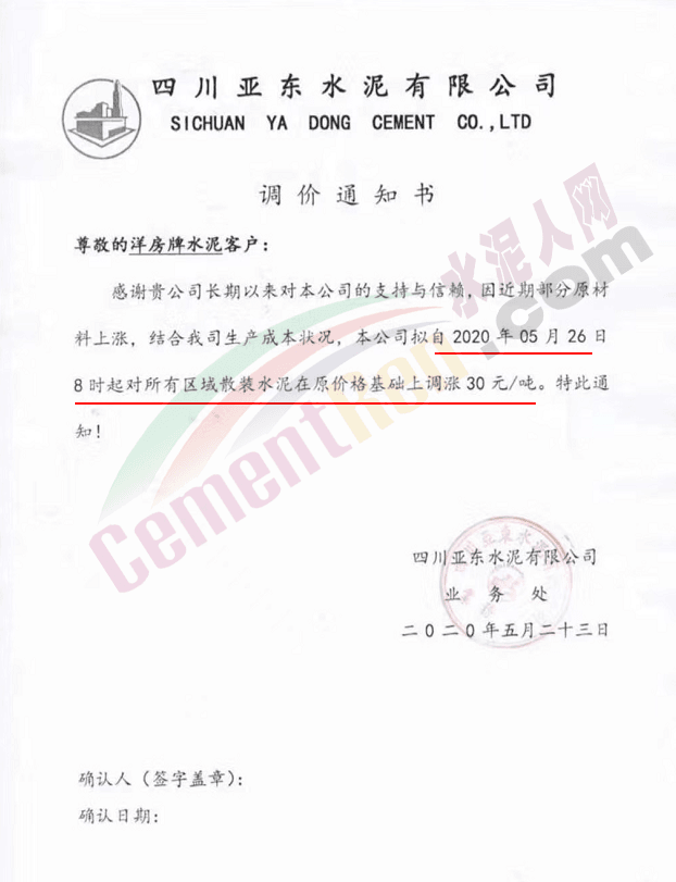 四川亞東水泥有限公司通知自5月26日8時(shí)起對(duì)所有區(qū)域散裝水泥在原價(jià)基礎(chǔ)上上調(diào)30元/噸。