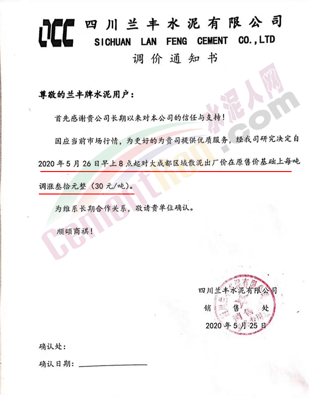 四川蘭豐水泥有限公司通知,自5月26日早8時(shí)起對(duì)大成都區(qū)域散裝水泥出廠價(jià)在原售價(jià)基礎(chǔ)上每噸上調(diào)30元。