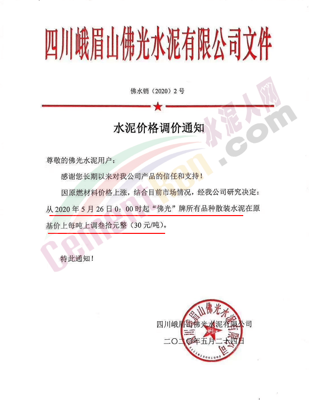 四川峨眉山佛光水泥有限公司通知稱,因原燃材料價(jià)格上漲,結(jié)合目前市場(chǎng)情況,經(jīng)公司研究決定 從5月26日0時(shí)起“佛光”牌所有品種散裝水泥在原基價(jià)上每噸上調(diào)30元。
