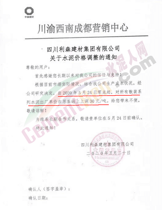 川渝西南成都營銷中心四川利森建材集團(tuán)通知自5月24日零點(diǎn)起,所有散裝系列水泥出廠單價(jià)上調(diào)30元/噸。