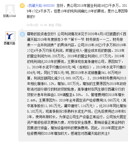 公司回答表示,公司利潤情況詳見于2020年4月18日披露的《西藏天路2019年年度報(bào)告》中“第十一節(jié) 財(cái)務(wù)報(bào)告――二、財(cái)務(wù)報(bào)表――合并利潤表”的具體內(nèi)容。公司2018年16億3千多萬和2019年17億4千多萬均系毛利潤,即營業(yè)收入-營業(yè)成本后的數(shù)據(jù)。2018年的營業(yè)利潤為96,235萬元,2019年的營業(yè)利潤92,277萬元。2019年的純利潤比2018年的要低,主要體現(xiàn)在高爭建材公司,原因如下: