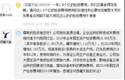 5月14日投資者也曾提問:“一年1.9個(gè)億的檢修費(fèi)用,你們還真舍得花錢啊,請問這1.9個(gè)億的檢修費(fèi)用使用的合理性和必要性在哪里?另外如果省點(diǎn)用能不能不用花這么多的檢修費(fèi)用?”