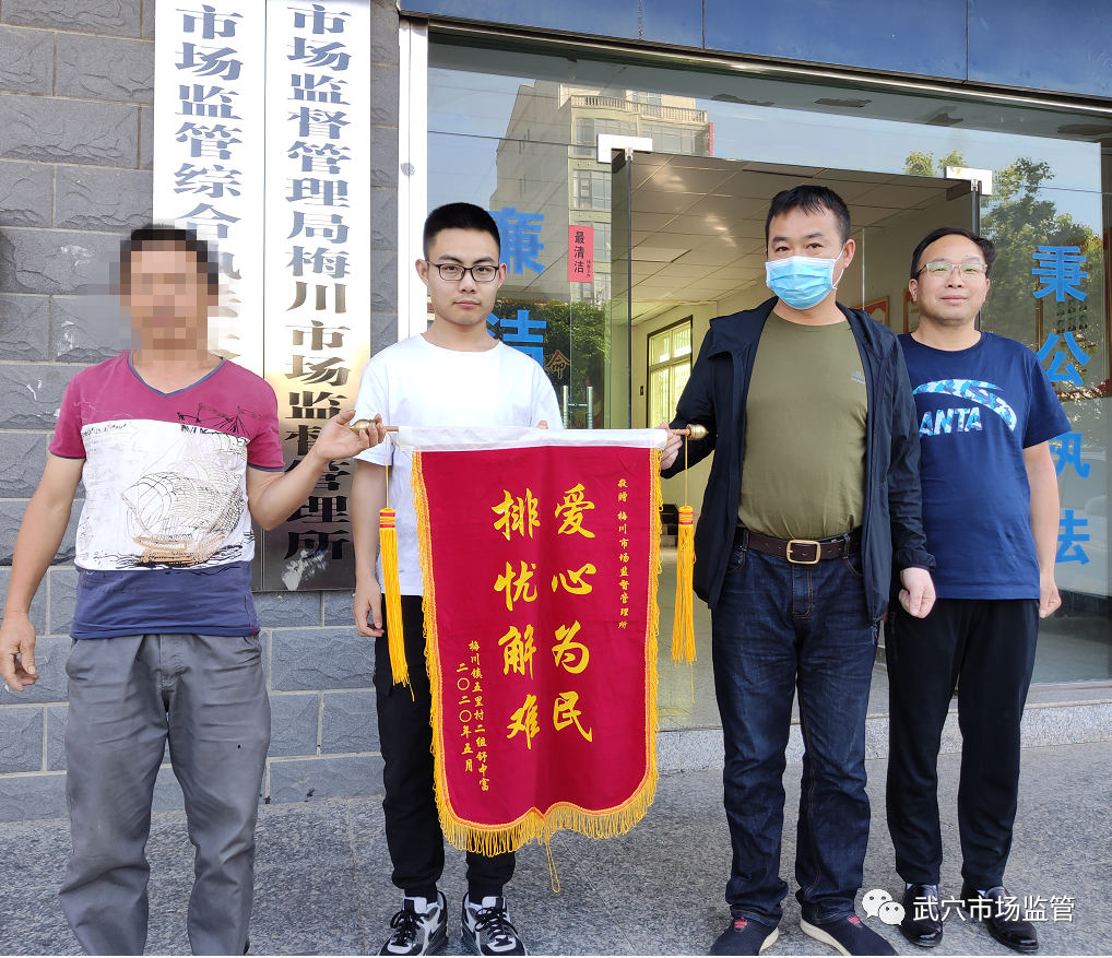 5月12日一大早,舒老漢親自到梅川市場(chǎng)監(jiān)管所贈(zèng)送錦旗一面,當(dāng)著梅川市場(chǎng)監(jiān)管所夏所長(zhǎng)和執(zhí)法維權(quán)同志的面,表達(dá)感激之情。