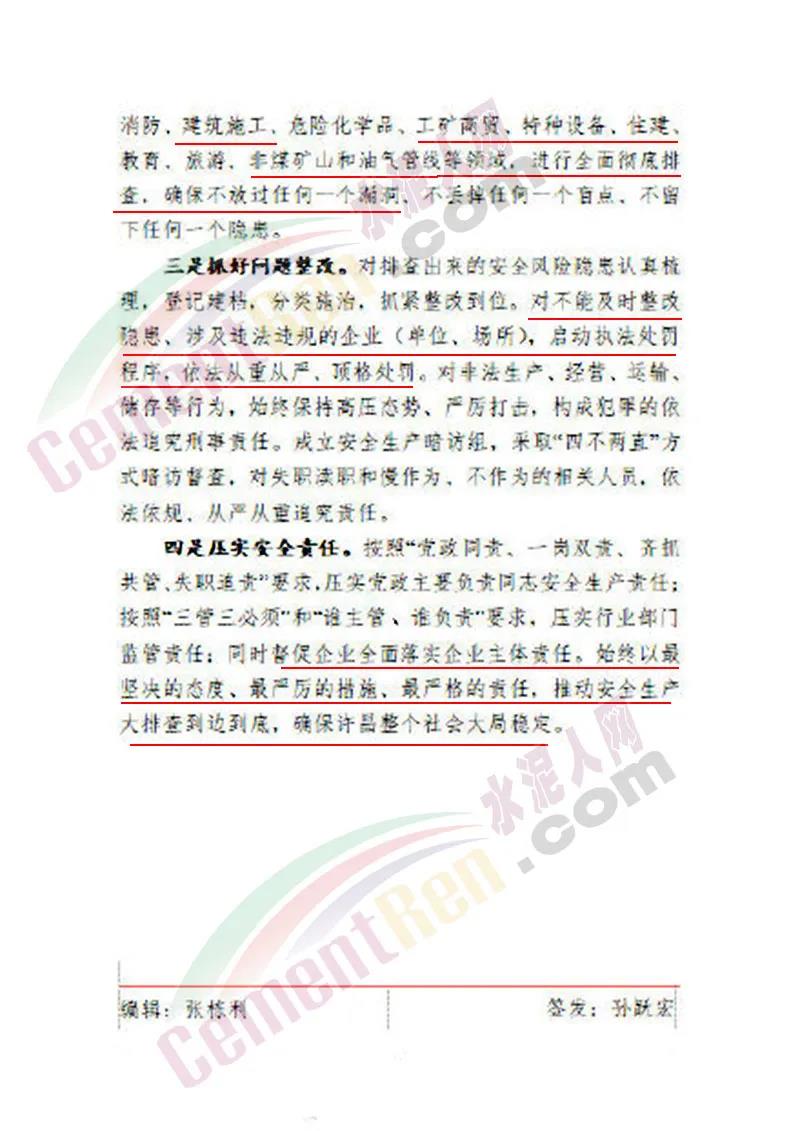 整改措施要求,按照“誰排查誰簽字”的原則,建立隱患排查臺(tái)賬,突出散亂污企業(yè)和廢棄廠院、煤礦、交通、消防、建筑施工、危險(xiǎn)化學(xué)品、工礦商貿(mào)、特種設(shè)備、住建、旅游、非煤礦山和油氣管線等領(lǐng)域,進(jìn)行全面徹底排查,確保不放過任何一個(gè)漏洞,不丟掉任何一個(gè)盲點(diǎn),不留下任何一個(gè)隱患。對不能及時(shí)整改隱患,涉及違法違規(guī)的企業(yè),啟動(dòng)執(zhí)法處罰程序 ,依法從重從嚴(yán),頂格處罰。同時(shí)壓實(shí)安全責(zé)任,督促企業(yè)全面落實(shí)企業(yè)主體責(zé)任。始終以最堅(jiān)決的態(tài)度 、最嚴(yán)厲的措施,最嚴(yán)格的責(zé)任,推動(dòng)安全生產(chǎn)大排查到邊到底,確保許昌整個(gè)社會(huì)大局穩(wěn)定。文件原文如下: