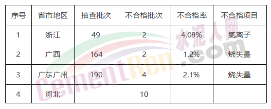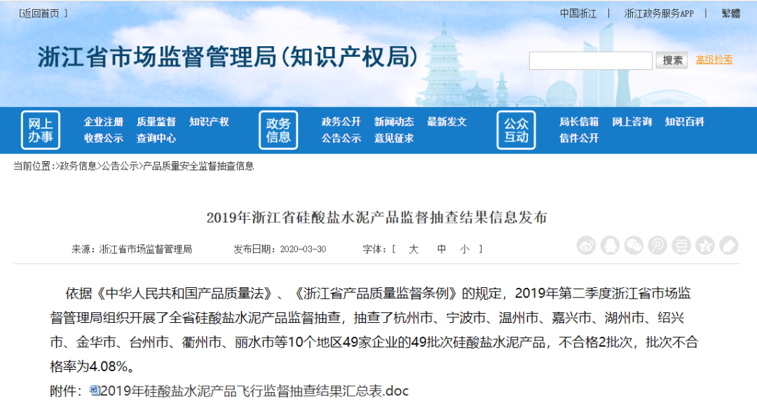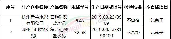 浙江省浙江省市場監(jiān)管局2019年硅酸鹽水泥產(chǎn)品監(jiān)督抽查結(jié)果顯示10個(gè)地區(qū)的49個(gè)批次產(chǎn)品中不合格2批次,不合格項(xiàng)目為氯離子。