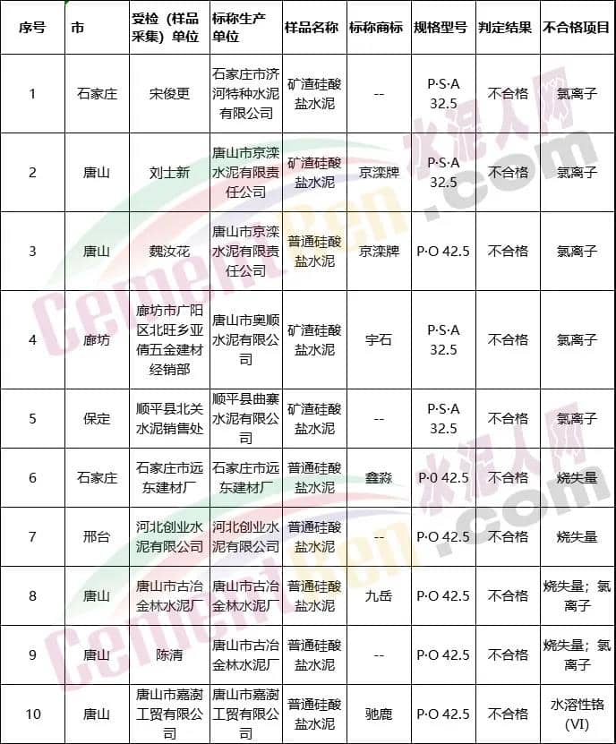 河北省河北省市場監(jiān)督管理局發(fā)布通報(bào)稱,抽查水泥、建筑防水卷材等21類產(chǎn)品共檢出不合格樣品188批次,不合格樣品檢出率為8.6%,其中水泥產(chǎn)品10個(gè)批次不合格,不合格項(xiàng)目涉及氯離子、燒失量以及水溶性鉻(Ⅵ)。