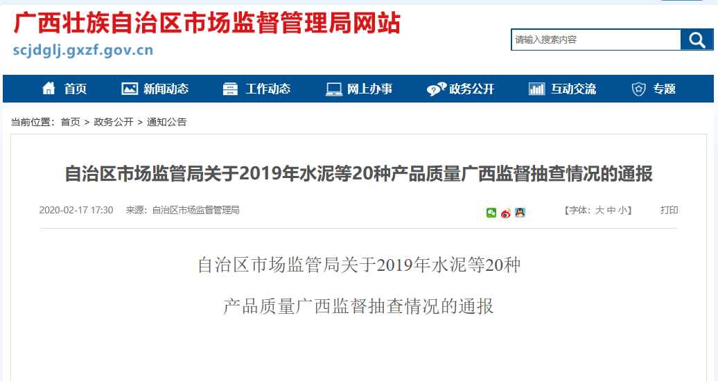 廣西市場監(jiān)管局官網(wǎng)通報(bào)2019年水泥等20種產(chǎn)品質(zhì)量廣西監(jiān)督抽查情況稱:2019年共抽查90家企業(yè)的166批次水泥產(chǎn)品,其中生產(chǎn)領(lǐng)域抽查159批次,流通領(lǐng)域抽查7批次。不合格產(chǎn)品2批次,不合格發(fā)現(xiàn)率為1.2%。其中生產(chǎn)領(lǐng)域抽查合格157批次,不合格產(chǎn)品2批次,不合格發(fā)現(xiàn)率為1.26%;抽查不合格項(xiàng)目為燒失量。