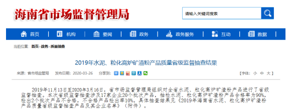 海南省市場監(jiān)督管理局公布2019年水泥、?;郀t礦渣粉產(chǎn)品質(zhì)量省級監(jiān)督抽查結(jié)果顯示,共抽查涉及17家企業(yè)20個(gè)批次產(chǎn)品,抽檢水泥、?;郀t礦渣粉產(chǎn)品合格率為90%,檢出2個(gè)批次產(chǎn)品不合格,不合格產(chǎn)品檢出率10%。