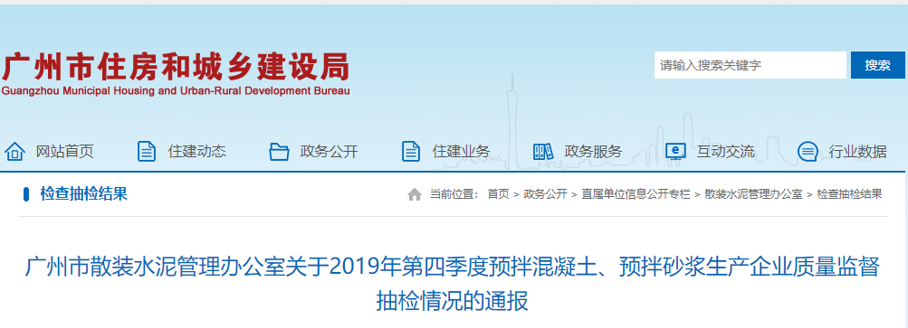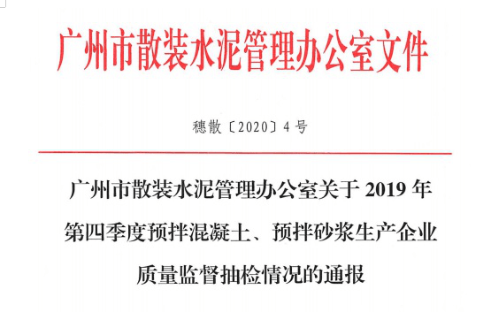廣州市散裝水泥管理辦公室發(fā)布《關(guān)于2019年第四季度預(yù)拌混凝土、預(yù)拌砂漿生產(chǎn)企業(yè)質(zhì)量監(jiān)督抽檢情況的通報(bào)》,共抽檢水泥190份,不合格4份。其中不合格水泥涉及兩家企業(yè),分別為華潤水泥(平南)有限公司、英德龍山水泥有限責(zé)任公司,不合格項(xiàng)目均為燒失量。