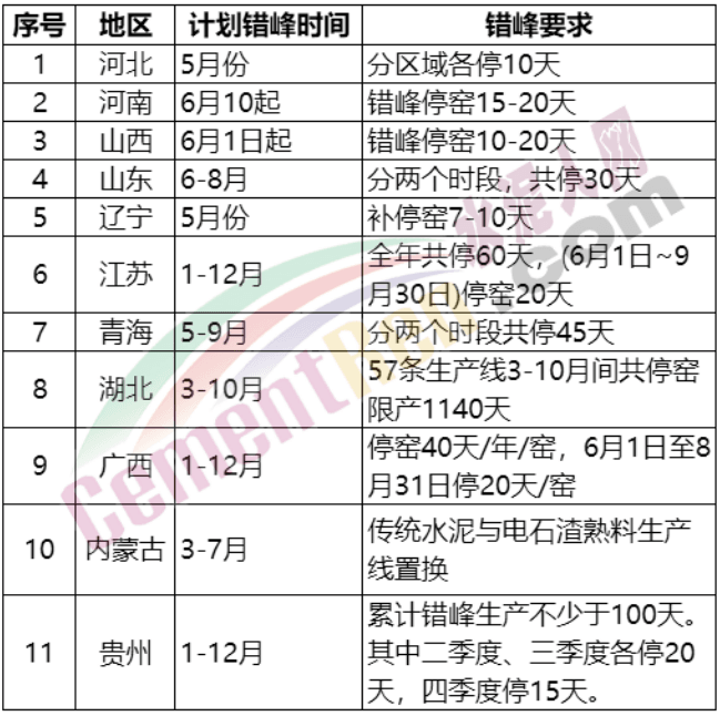 近日,山東、山西、河南省通知區(qū)域內(nèi)水泥熟料生產(chǎn)線將于6月份開始錯(cuò)峰生產(chǎn)。江蘇省通知熟料生產(chǎn)線于6月1日-9月30日停窯20天。廣西壯族自治區(qū)水泥協(xié)會(huì)通知2020年6月1日至8月31日停20天/窯。