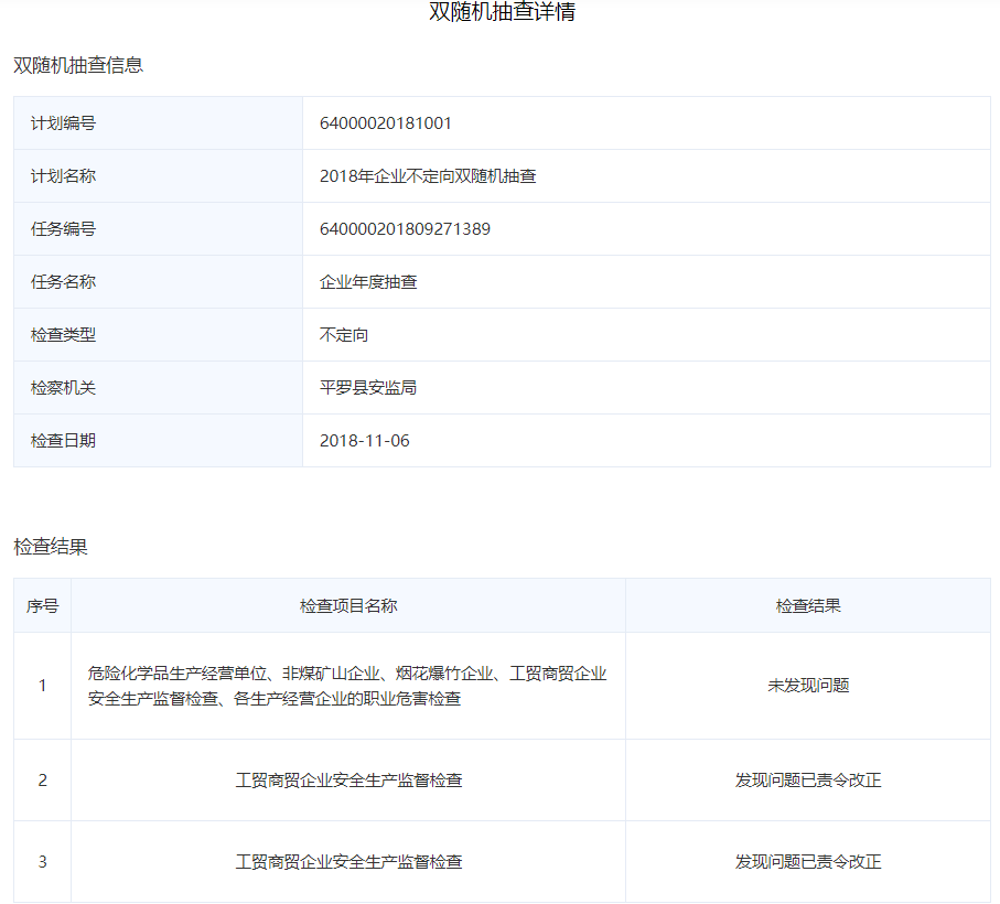 2018年11月6日平羅縣安監(jiān)局公布的2018年企業(yè)不定向雙隨機抽查中檢查結(jié)果為發(fā)現(xiàn)問題并已責(zé)令改正。