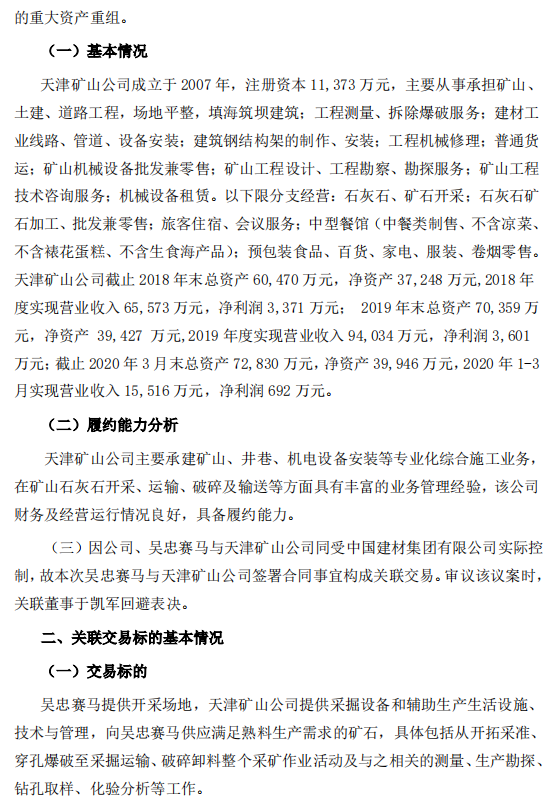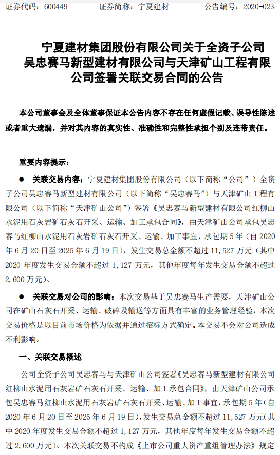 昨日(6月1日)寧夏建材(600449.SH)公布,公司全資子公司吳忠賽馬與天津礦山工程有限公司(以下簡(jiǎn)稱“天津礦山公司”)簽署《吳忠賽馬新型建材有限公司紅柳山水泥用石灰?guī)r礦石灰石開采、運(yùn)輸、加工承包合同》,由天津礦山公司承包吳忠賽馬紅柳山水泥用石灰?guī)r礦石灰石開采、運(yùn)輸、加工事宜,承包期5年(自2020年6月20日至2025年6月19日),發(fā)生交易總金額不超過1.15億元(其中2020年度發(fā)生交易金額不超過1127萬元,其他年度每年發(fā)生交易金額不超過2600萬元)。