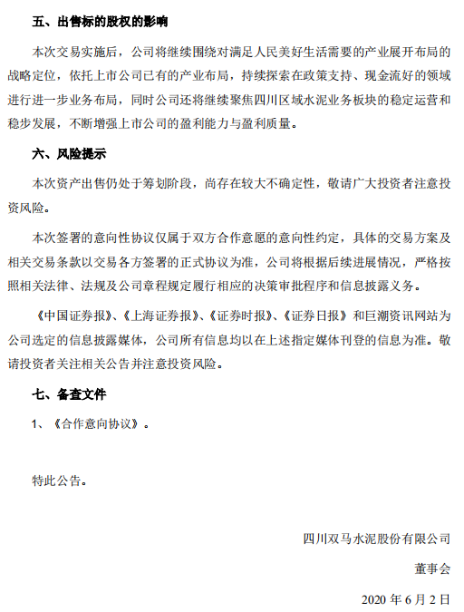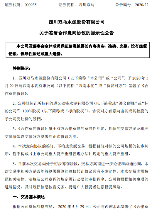 公告特別提示稱(chēng):四川雙馬水泥股份有限公司已于 2020 年 5月 29 日與西南水泥有限公司簽署了《合作意向協(xié)議》。公司擬轉(zhuǎn)讓所持有的遵義礪鋒水泥有限公司100%股權(quán) 。