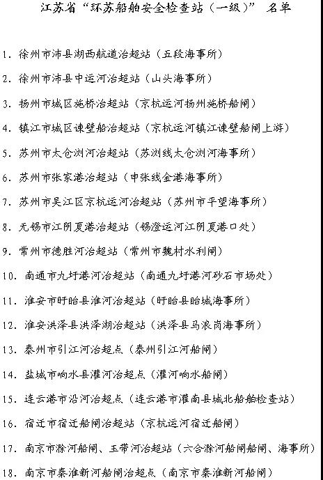 江蘇省將在省際相鄰水域、京杭運河沿線和通江口門等處建立18個“江蘇省環(huán)蘇船舶安全檢查站(一級)”作為“治超站”(名單附后),對過往船舶實施現(xiàn)場檢查。對外省擬進入我省內(nèi)河水域的超載超限船舶,各檢查站點要采取勸返、驅(qū)離的方式,禁止此類船舶進入我省內(nèi)河水域。