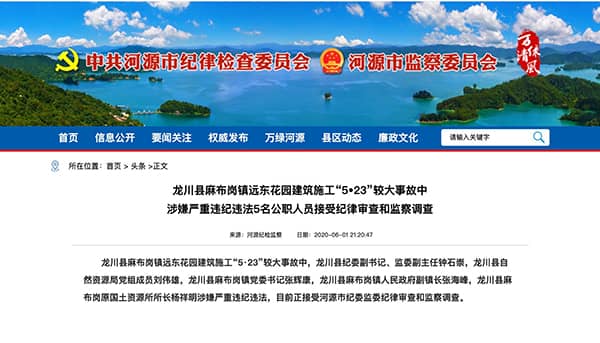另在有關(guān)當(dāng)?shù)厥蓄I(lǐng)導(dǎo)的公開(kāi)報(bào)道中,至少包括市委書(shū)記、市人大常委會(huì)主任丁紅都;市長(zhǎng)林濤;副市長(zhǎng)劉東豪;副市長(zhǎng)何偉良在內(nèi)的市領(lǐng)導(dǎo)到中心城區(qū)、源城區(qū)和江東新區(qū)、江東新區(qū)等地檢查督導(dǎo)建筑工地安全生產(chǎn)工作。此次通報(bào)涉嫌嚴(yán)重違紀(jì)違法的5人中,2人屬國(guó)土資源領(lǐng)域公職人員(含退休1人);2人屬發(fā)生事故的麻布崗鎮(zhèn)領(lǐng)導(dǎo),另有1人屬該縣紀(jì)檢監(jiān)察干部。其中,鐘石崇在2018年1月龍川縣監(jiān)察委員會(huì)掛牌成立后當(dāng)選監(jiān)委副主任;龍川縣麻布崗鎮(zhèn)人民政府副鎮(zhèn)長(zhǎng)張海峰為該鎮(zhèn)常務(wù)副鎮(zhèn)長(zhǎng),負(fù)責(zé)應(yīng)急管理、安全生產(chǎn)、自然資源等工作;龍川縣自然資源局黨組成員劉偉雄分管管執(zhí)法、自然資源開(kāi)發(fā)利用與所有者權(quán)益、臨時(shí)用地等工作,掛鉤聯(lián)系事故發(fā)生地的“麻布崗”自然資源所。而就在龍川縣麻布崗鎮(zhèn)遠(yuǎn)東花園建筑施工“5·23”較大事故發(fā)生后的5月25日,廣東省委第八巡視組發(fā)布巡視公告稱(chēng),按照省委巡視工作統(tǒng)一部署,5月25日至7月中旬,省委第八巡視組對(duì)龍川縣開(kāi)展巡視。