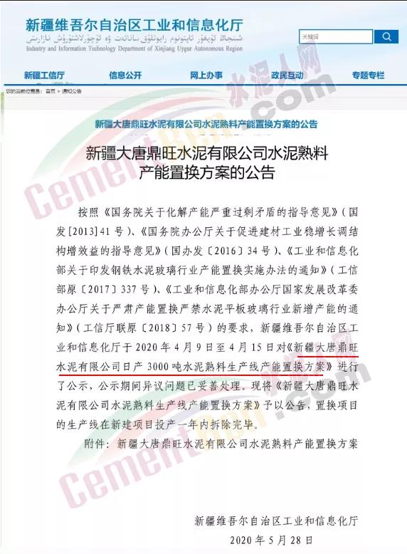 圖:新疆大唐鼎旺水泥有限公司日產(chǎn)3000噸水泥熟料生產(chǎn)線產(chǎn)能置公告