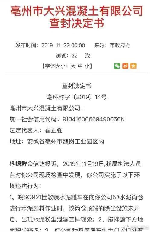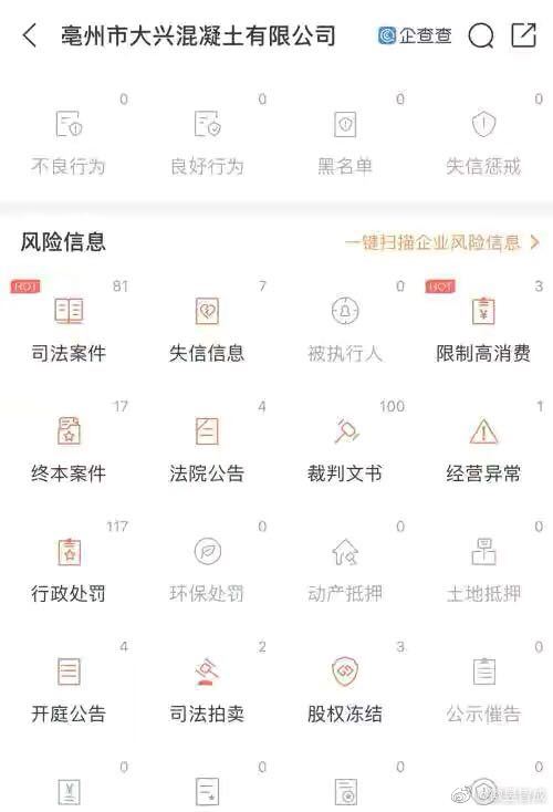 企查查提示:亳州市大興混凝土有限公司法人代表為崔正強,該公司因為違反大氣污染防治管理制度和機動車違反禁令標志等違法違規(guī)行為,曾被行政處罰高達117次。