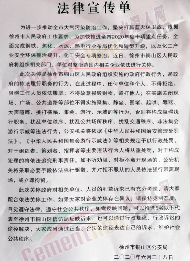 同期,徐州銅山區(qū)茅村派出所將一份28日發(fā)布的《法律宣傳單》送到淮海中聯(lián)工廠。宣傳單中提到為進(jìn)一步推動(dòng)全市大氣污染防治工作,堅(jiān)決打高藍(lán)天保衛(wèi)戰(zhàn),根據(jù)徐州市人民政府工作要求,為加快推進(jìn)全市2020年度十項(xiàng)重點(diǎn)任務(wù),全面完成鋼鐵、焦化、水泥、熱電行業(yè)布局優(yōu)化和轉(zhuǎn)型升級(jí),以及化工產(chǎn)業(yè)安全環(huán)保整治提升、化工安全專項(xiàng)整治。近日,徐州市銅山區(qū)人民政府將組織相關(guān)部門、單位對(duì)整治范圍內(nèi)相關(guān)企業(yè)依法進(jìn)行關(guān)停。