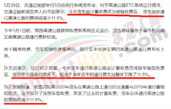 吳德金局長特別強(qiáng)調(diào),在今年1月1日貨車由計(jì)重收費(fèi)調(diào)整為按車(軸)型收費(fèi)后,部分公眾反映一些地區(qū)的貨車通行費(fèi)增長了。為此,交通運(yùn)輸部會(huì)同發(fā)展改革委和財(cái)政部,認(rèn)真分析測算,提出了處理意見。相關(guān)地區(qū)人民政府組織有關(guān)單位認(rèn)真落實(shí)上述三點(diǎn)要求,通過調(diào)整貨車收費(fèi)標(biāo)準(zhǔn)和實(shí)行高速公路差異化收費(fèi)的方式,降低了貨車實(shí)際通行費(fèi)支出。