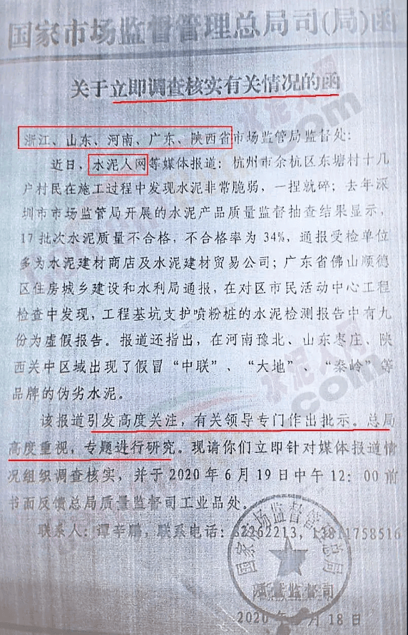 文件稱水泥質(zhì)量問題事關(guān)建筑工程質(zhì)量百年大計,事關(guān)群眾生命財產(chǎn)安全和企業(yè)合法權(quán)益,事關(guān)質(zhì)量強國戰(zhàn)略實話,事關(guān)市場秩序和營商環(huán)境 ,國務(wù)院領(lǐng)導(dǎo)專題做出指示要求嚴厲查處水泥質(zhì)量問題,省局領(lǐng)導(dǎo)高度重視,要求嚴格貫徹國務(wù)院領(lǐng)導(dǎo)重要指示精神,嚴格執(zhí)行聯(lián)合調(diào)查組精神,忠實履職盡責,加強監(jiān)管執(zhí)法劣實工作責任,限期查處問題,維護群眾利益和企業(yè)合法權(quán)益,維護良好市場秩序。