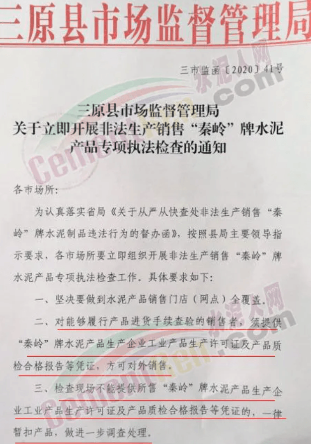 同期,陜西咸陽市三原縣市場監(jiān)督管理局發(fā)布《關(guān)于立即開展非法生產(chǎn)銷售“秦嶺 ”牌水泥產(chǎn)品專項執(zhí)法檢查的通知》稱,為認真落實省局《關(guān)于從嚴從快查處非法生產(chǎn)銷售“秦嶺”牌水泥制品違法行為的督辦函》按照縣局主要領(lǐng)導(dǎo)指示要求,各市場 所要立即組織開展非法生產(chǎn)銷售“秦嶺”牌水泥產(chǎn)品專項執(zhí)法檢查工作。具體要求為: