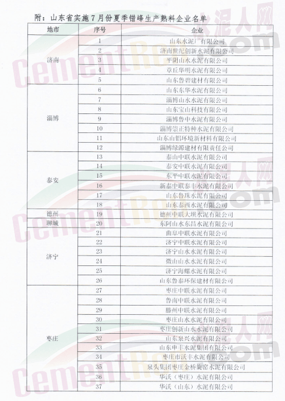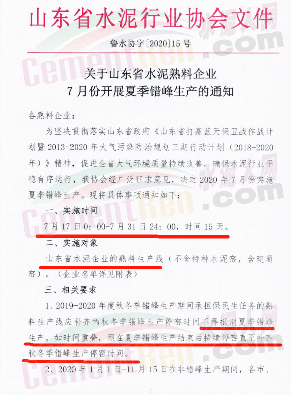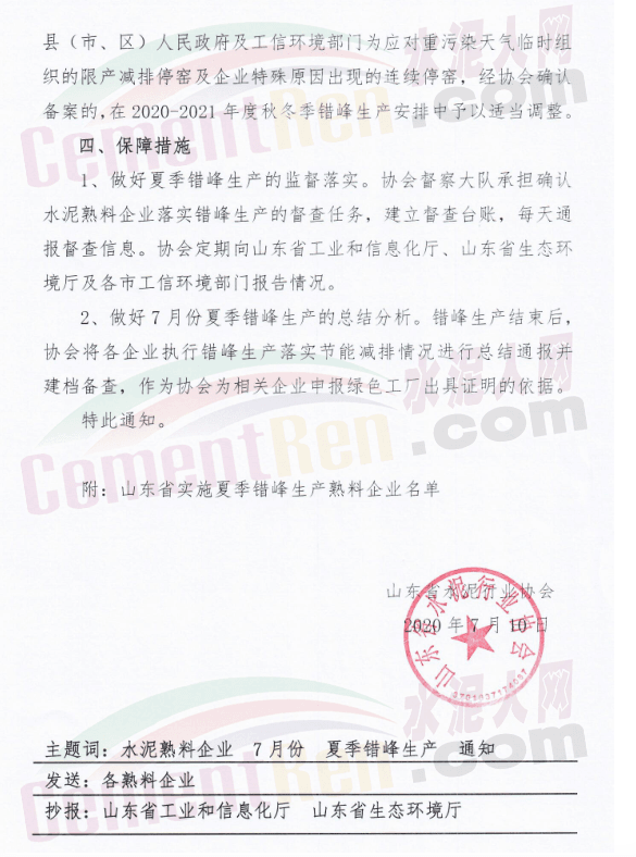 據(jù)水泥人網(wǎng)消息,近日,山東省水泥行業(yè)協(xié)會發(fā)布《關于山東省水泥熟料企業(yè)7月份開展夏季錯峰生產的通知》稱:為堅決貫徹落實山東省政府《山東省打瀛藍天保衛(wèi)戰(zhàn)作戰(zhàn)計劃暨2013-2020年大氣污染防治規(guī)劃三期行動計劃(201-2020年)》精神,促進全省大氣環(huán)境質量持續(xù)改善,確保水泥行業(yè)平穩(wěn)有序運行,山東省水泥協(xié)會決定2020年7月份實施夏季錯峰生產,具體通知如下: