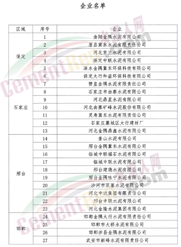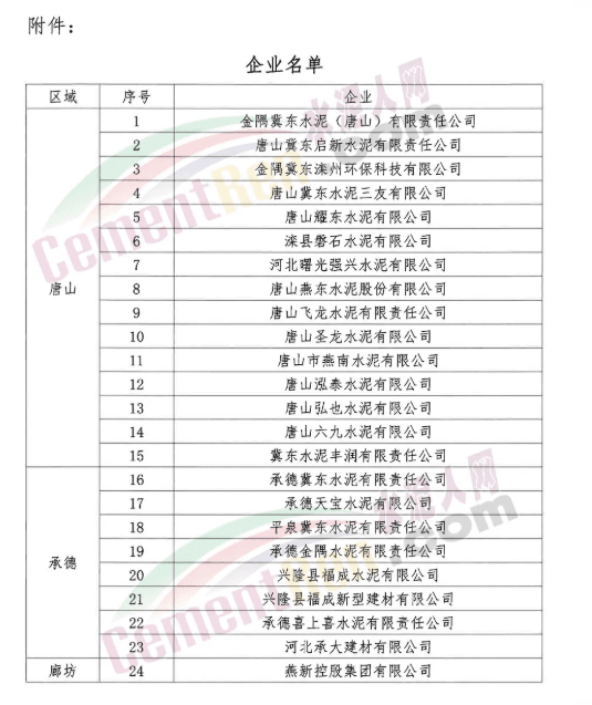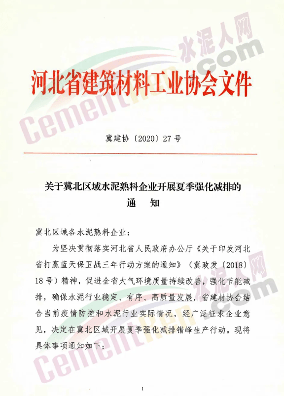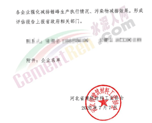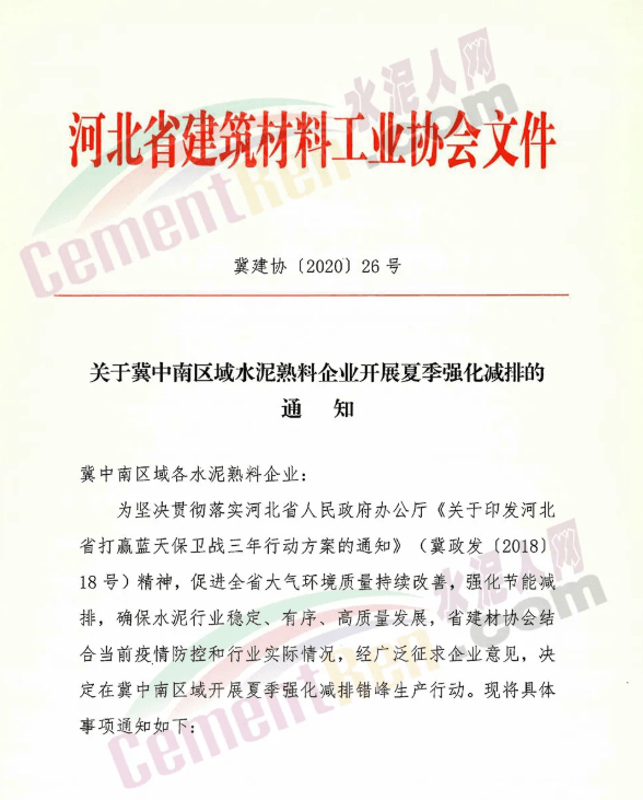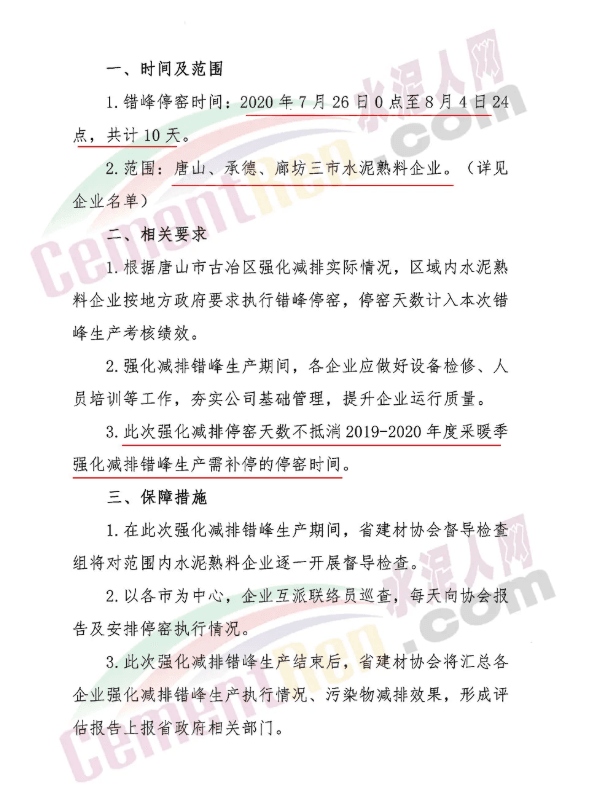 邯鄲、邢臺、石家莊、保定四市水泥熟料企業(yè)從2020年7月20日0時至7月29日24時,共停10天。其中,河北金隅鼎鑫水泥有限公司和河北曲寨礦峰水泥股份有限公司已于2020年7月10日0時至7月19日24時,提前執(zhí)行錯峰生產(chǎn),共計10天;根據(jù)邢臺區(qū)域強化減排實際情況,區(qū)域內(nèi)水泥熟料企業(yè)按地方政府要求執(zhí)行錯峰停窯,停窯天數(shù)計入本次錯峰生產(chǎn)考核績效。原文件如下: