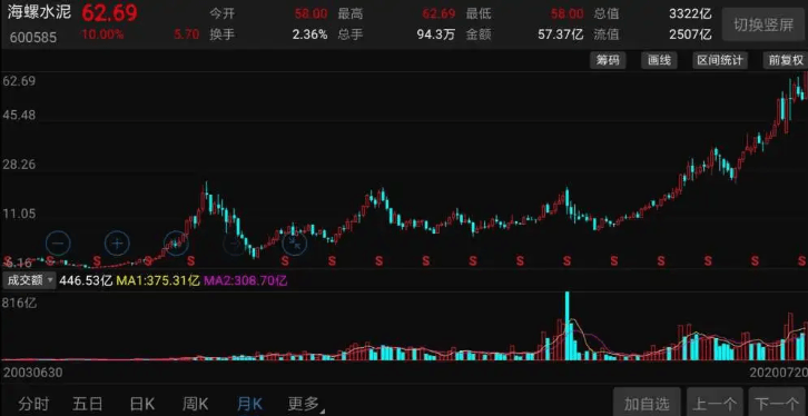 其中,全國(guó)最大水泥制造公司海螺水泥漲停,市值超過(guò)3300億,達(dá)到3322億。其余幾只水泥股,上峰水泥漲超9%、北新建材漲停、祁連山漲超8%、萬(wàn)年青漲停。