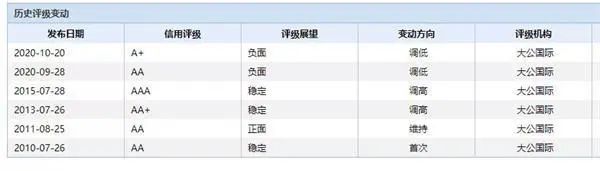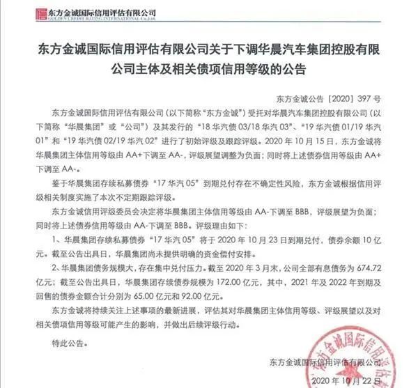 大公表示,按照2017年9月華晨集團(tuán)與債權(quán)投資計劃受托人太平資產(chǎn)管理有限公司簽署的《太平一一華晨汽車制造產(chǎn)業(yè)升級債權(quán)投資計劃投資合同》約定,華晨集團(tuán)應(yīng)于2020年9月21日劃撥季度應(yīng)付利息。截至2020年10月14日,華晨集團(tuán)仍未將應(yīng)付季度利息劃撥至債權(quán)投資計劃托管人賬戶。而東方金誠很罕見的在債券違約當(dāng)天就掛出了評級下調(diào)公告,華晨集團(tuán)的主體信用評級再一次斷崖式下跌至BBB。