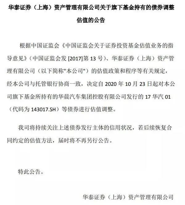 華泰證券資管稱公告稱,公司決定自 2020 年 10 月 23 日起對旗下基金所持有的華晨汽車集團(tuán)控股有限公司發(fā)行的 17 華汽 01(代碼為 143017.SH)等債券進(jìn)行估值調(diào)整。