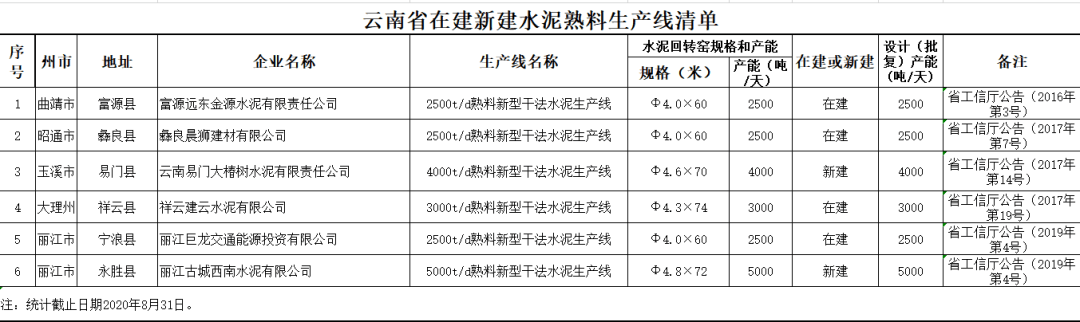 9月末云南省工信廳發(fā)布了云南省水泥熟料生產(chǎn)線清單公告,其中明確截止到2020年8月31日共有四條新型干法水泥熟料生產(chǎn)線在建,其中兩條為新建項(xiàng)目,設(shè)計(jì)產(chǎn)能合計(jì)585萬噸/年。