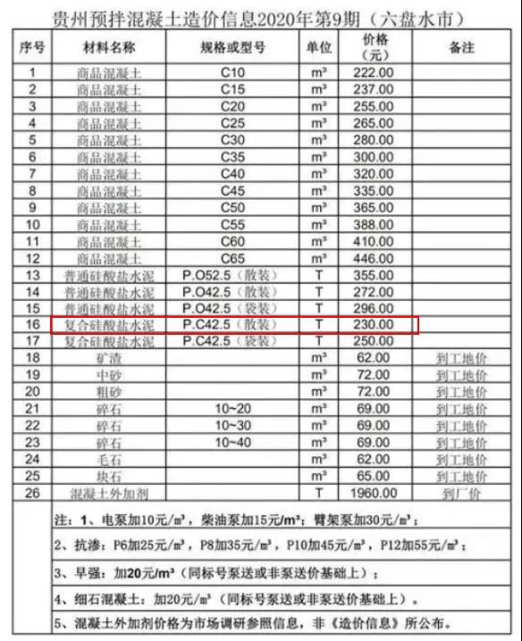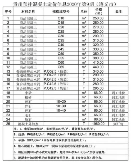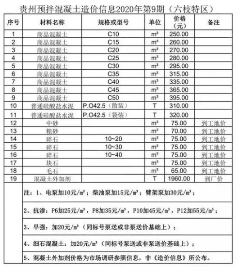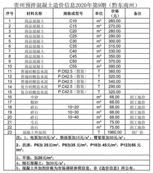 近日,貴州省預(yù)拌混凝土行業(yè)協(xié)會(huì)發(fā)布了貴州省預(yù)拌混凝土造價(jià)信息2020年第9期。造價(jià)信息顯示,商品混凝土平均價(jià)格高于干拌商品砂漿、硅酸鹽水泥等其他預(yù)拌混凝土。其中,黔南州商品混凝土C65價(jià)格最高,為455元/立方;黔南州毛石價(jià)格最低,為55元/立方。
