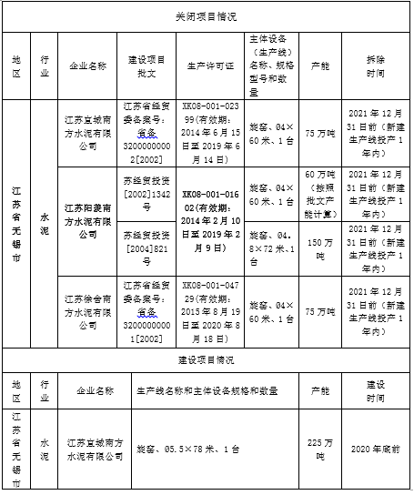 公告內(nèi)容顯示,建設(shè)項(xiàng)目為一條年產(chǎn)225萬噸的熟料生產(chǎn)線,回轉(zhuǎn)窯直徑為5.5×78米,建設(shè)時(shí)間為2020年底前。關(guān)閉退出項(xiàng)目為江蘇陽羨南方水泥有限公司210萬噸生產(chǎn)線、江蘇徐舍南方水泥有限公司75萬噸生產(chǎn)線和江蘇宜城南方水泥有限公司原有75萬噸生產(chǎn)線,退出時(shí)間為2021年12月31日前,即新建生產(chǎn)線投產(chǎn)一年內(nèi)。