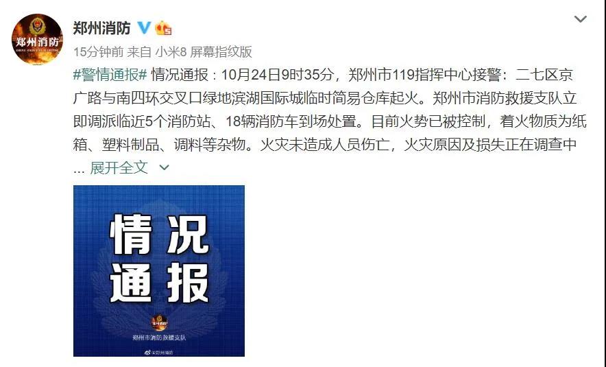 隨后,鄭州消防發(fā)布情況通報(bào)稱,10月24日9時(shí)35分,鄭州市119指揮中心接警:二七區(qū)京廣路與南四環(huán)交叉口綠地濱湖國(guó)際城臨時(shí)簡(jiǎn)易倉(cāng)庫(kù)起火。鄭州市消防救援支隊(duì)立即調(diào)派臨近5個(gè)消防站、18輛消防車到場(chǎng)處置。目前火勢(shì)已被控制,著火物質(zhì)為紙箱、塑料制品、調(diào)料等雜物?;馂?zāi)未造成人員傷亡,火災(zāi)原因及損失正在調(diào)查中。