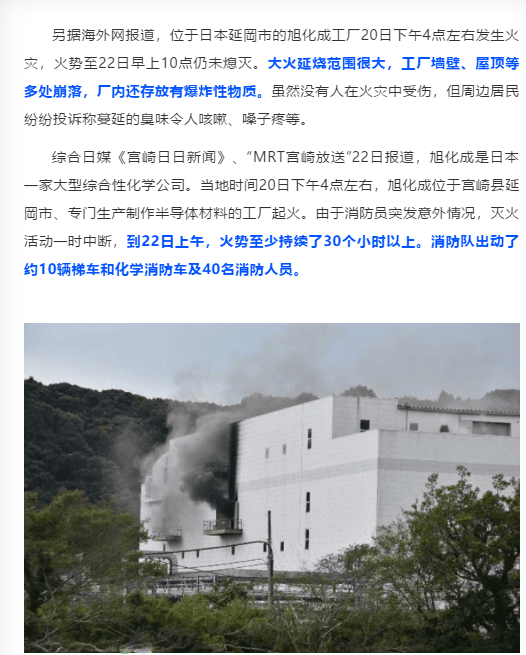 這家工廠負(fù)責(zé)生產(chǎn)旭化成公司用于音響器械、家電產(chǎn)品等的半導(dǎo)體設(shè)備。起火地點(diǎn)位于工廠4層。22日上午,工廠5層的房頂和西側(cè)墻壁全部崩塌起火。目前沒有人在火災(zāi)中受傷,但工廠周邊持續(xù)蔓延著異臭和黑煙。住在附近的不少居民稱嗓子疼、咳嗽等,并紛紛投訴稱“臭味無(wú)法忍受”“幾乎吃不了飯”。旭化成方面回應(yīng)稱,工廠內(nèi)的電線是鹽化塑料材質(zhì),燃燒后會(huì)產(chǎn)生氣味,“并未達(dá)到會(huì)對(duì)人體產(chǎn)生影響的濃度”。日媒稱,工廠內(nèi)還存有爆炸性物質(zhì)甲硅烷。這是一種無(wú)色氣體,遇到空氣可能發(fā)生小規(guī)模爆炸性自燃。但旭化成公司稱,不會(huì)對(duì)工廠外部造成危險(xiǎn)。22日白天,約70名消防人員在現(xiàn)場(chǎng)進(jìn)行滅火工作。