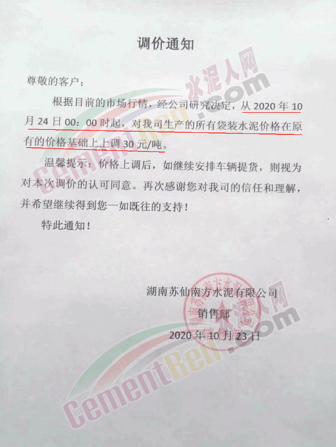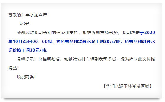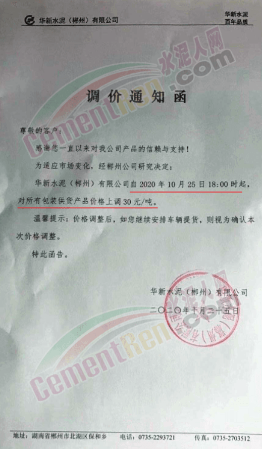 華新水泥(郴州)有限公司通知,自10月25日18時(shí)起對(duì)所有包裝供貨產(chǎn)品價(jià)格上調(diào)30元/噸。