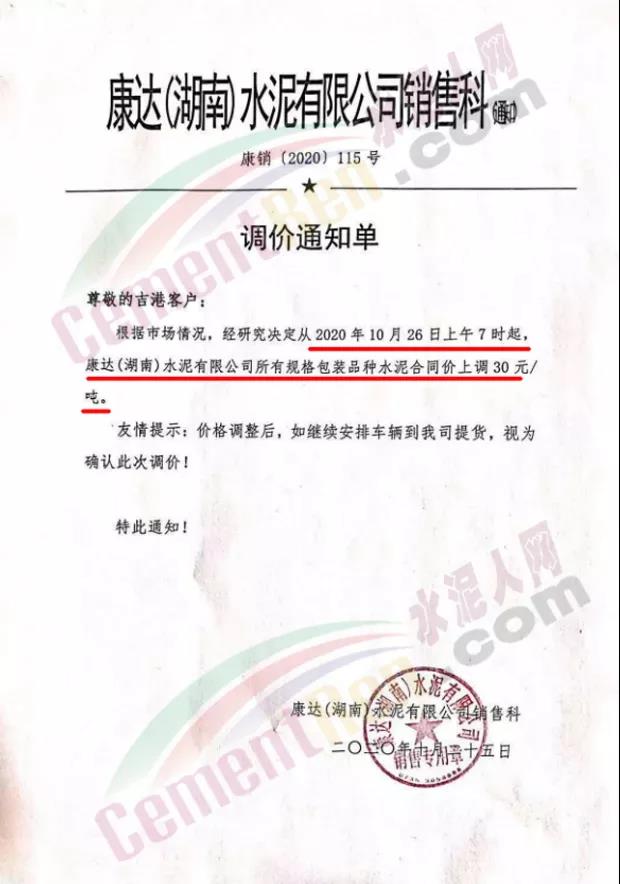 紅獅水泥旗下康達(dá)(湖南)水泥有限公司銷售科通知,自10月26日上午7時(shí)起,所有規(guī)格包裝品種水泥合同價(jià)上調(diào)30元/噸。