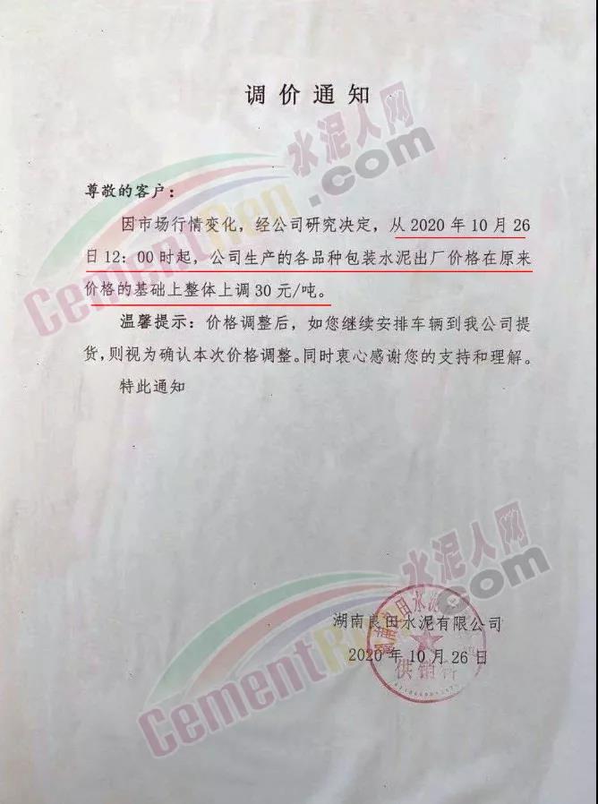 湖南良田水泥有限公司通知自10月26日12時(shí)起,公司生產(chǎn)的各品種包裝水泥出廠價(jià)格在原來價(jià)格的基礎(chǔ)上整體上調(diào)30元/噸。